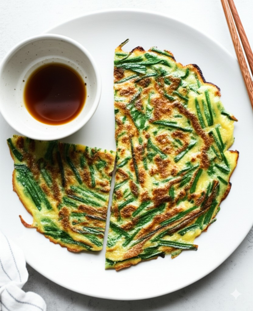 <이미지: 노릇노릇하게 구워진 미나리전 (초록색 미나리가 촘촘히 박혀 있고, 가장자리가 바삭한 클로즈업 사진)>