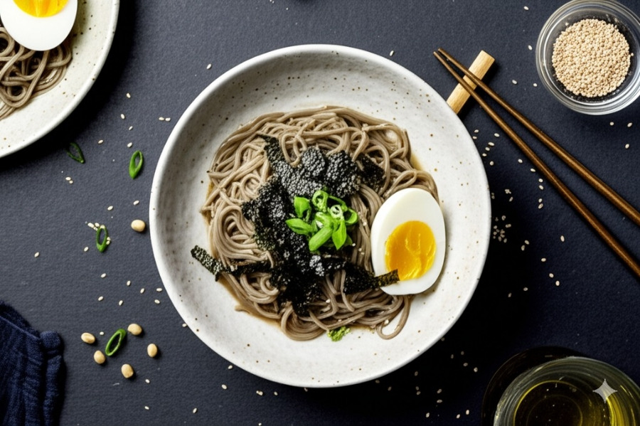 <이미지: 완성된 들기름 막국수 (그릇에 삶은 메밀면이 담겨 있고, 김가루가 듬뿍 뿌려져 있으며, 들기름과 간장 양념이 촉촉하게 배어있는 모습. 소박하면서도 먹음직스러운 느낌)>