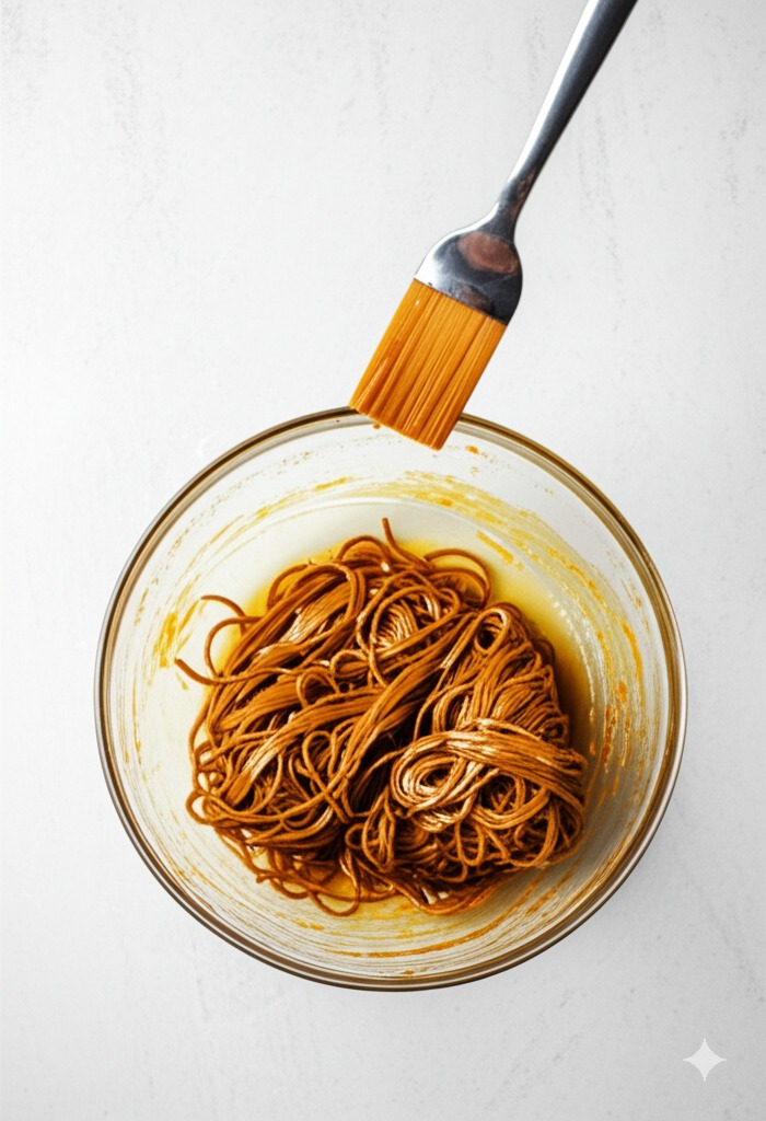 <이미지: 삶은 메밀면에 들기름, 간장, 깨소금을 넣고 비비는 모습>