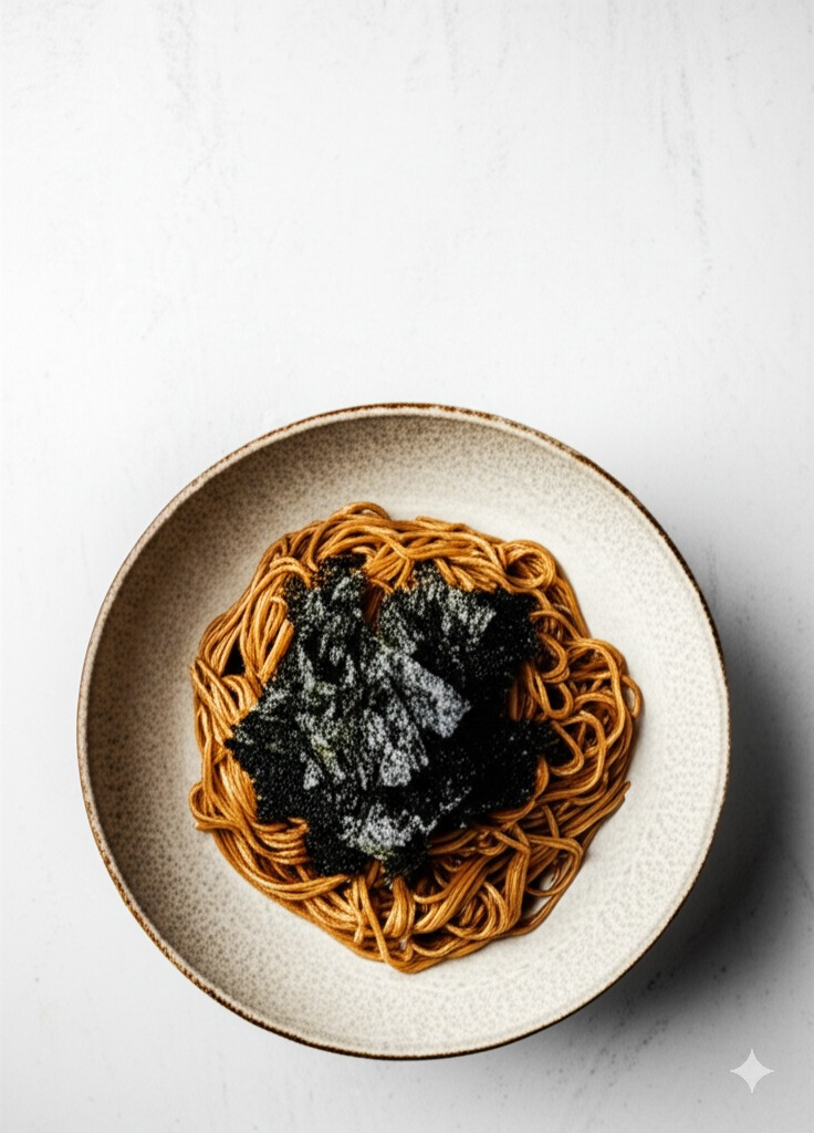 <이미지: 양념한 메밀면을 그릇에 담고 김가루를 올리는 모습>