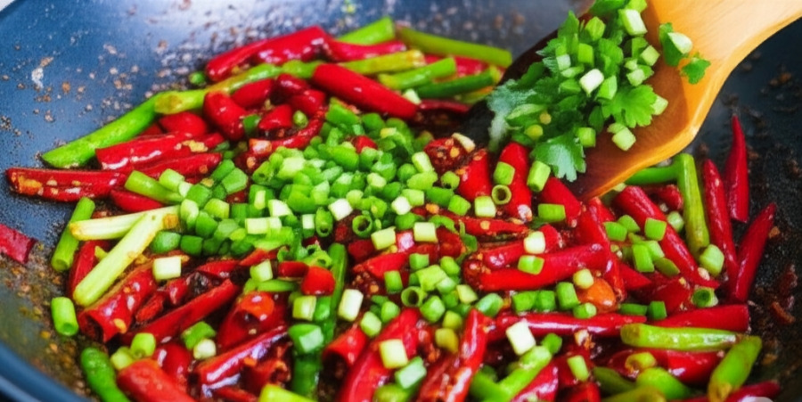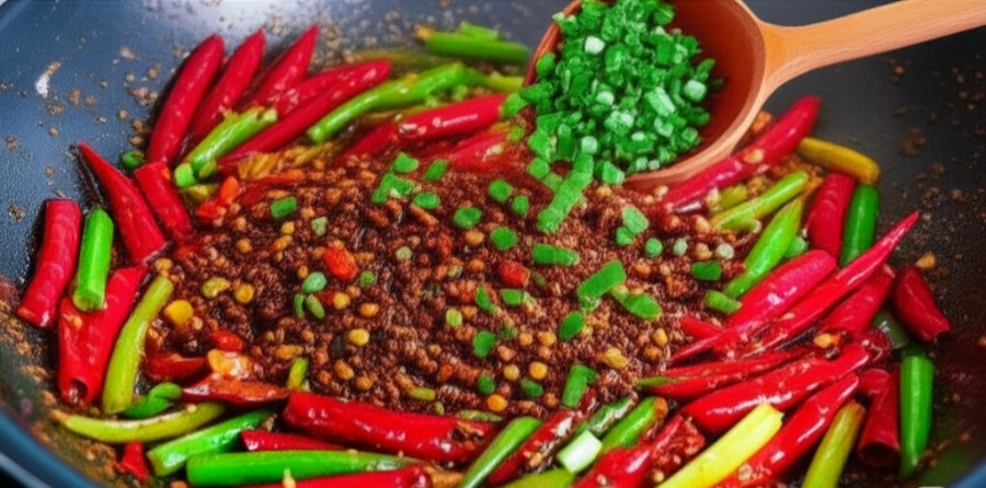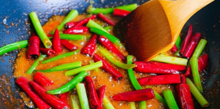 <이미지: 달궈진 팬에 식용유를 두르고 통산초와 건고추를 넣어 약불에서 볶아 향을 내는 모습. 기름에 붉은색과 얼얼한 향이 배어난다.>