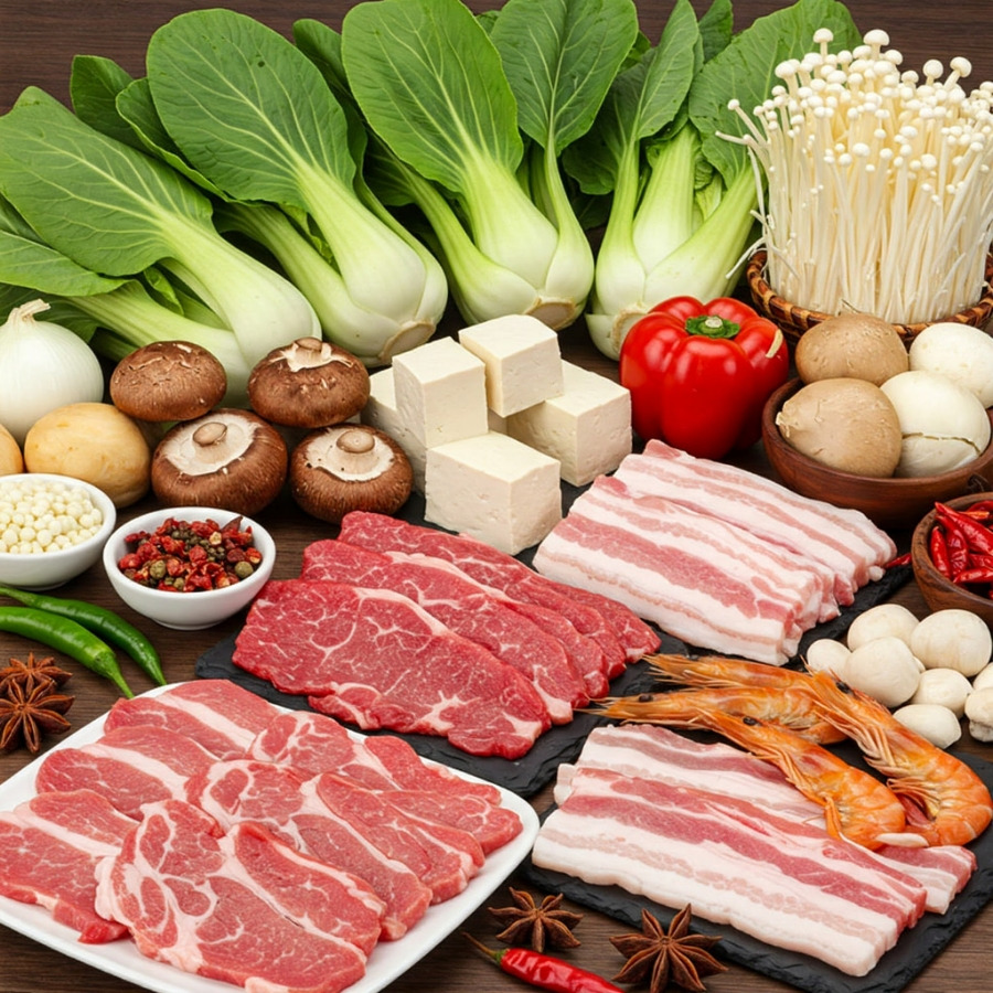 * 육류/해산물: 소고기 또는 돼지고기 샤브샤브용, 얇게 썬 양고기, 새우, 오징어, 비엔나 소시지, 푸주(불린 것) 등