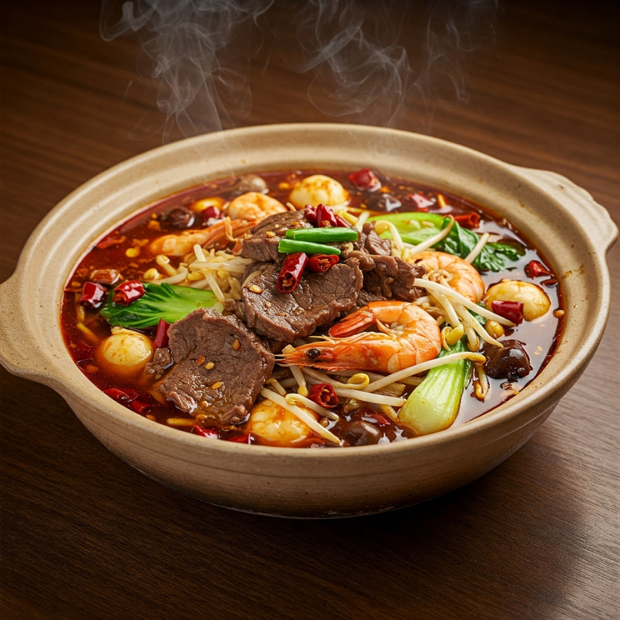 <이미지: 넓고 깊은 냄비나 팬에 푸짐하게 담긴 마라샹궈. 빨간 마라 소스에 윤기 나게 볶아진 얇게 썬 소고기, 통통한 새우, 하얀 건두부, 다양한 색의 채소(청경채, 연근 등), 버섯 등이 가득 담겨 있어 먹음직스럽고 풍성해 보인다. 위에 마른 고추나 마라의 기름이 살짝 보인다.>