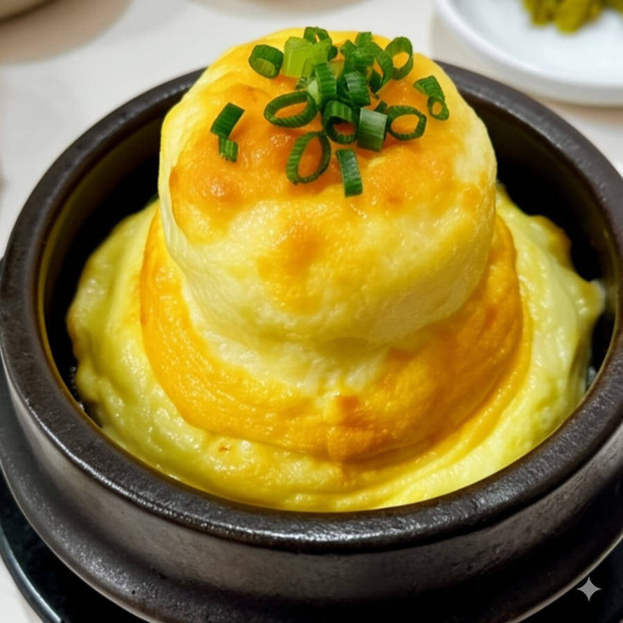 <이미지: 뚝배기 안에서 봉긋하게 솟아오른 폭탄 계란찜 (김이 모락모락 나고, 파 등의 고명이 뿌려진 클로즈업 사진)>