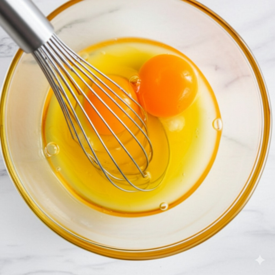 <이미지: 볼에 계란을 깨서 거품기로 풀어주는 모습>