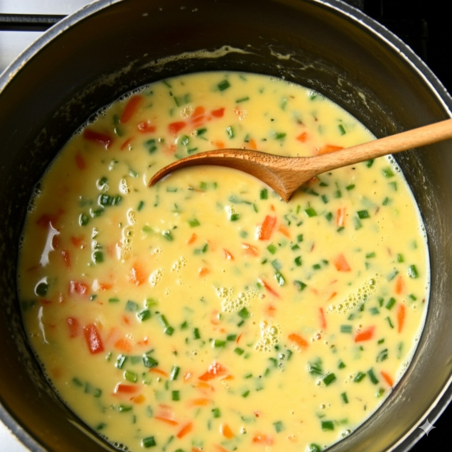 <이미지: 풀어놓은 계란물에 물 또는 쌀뜨물을 붓는 모습>