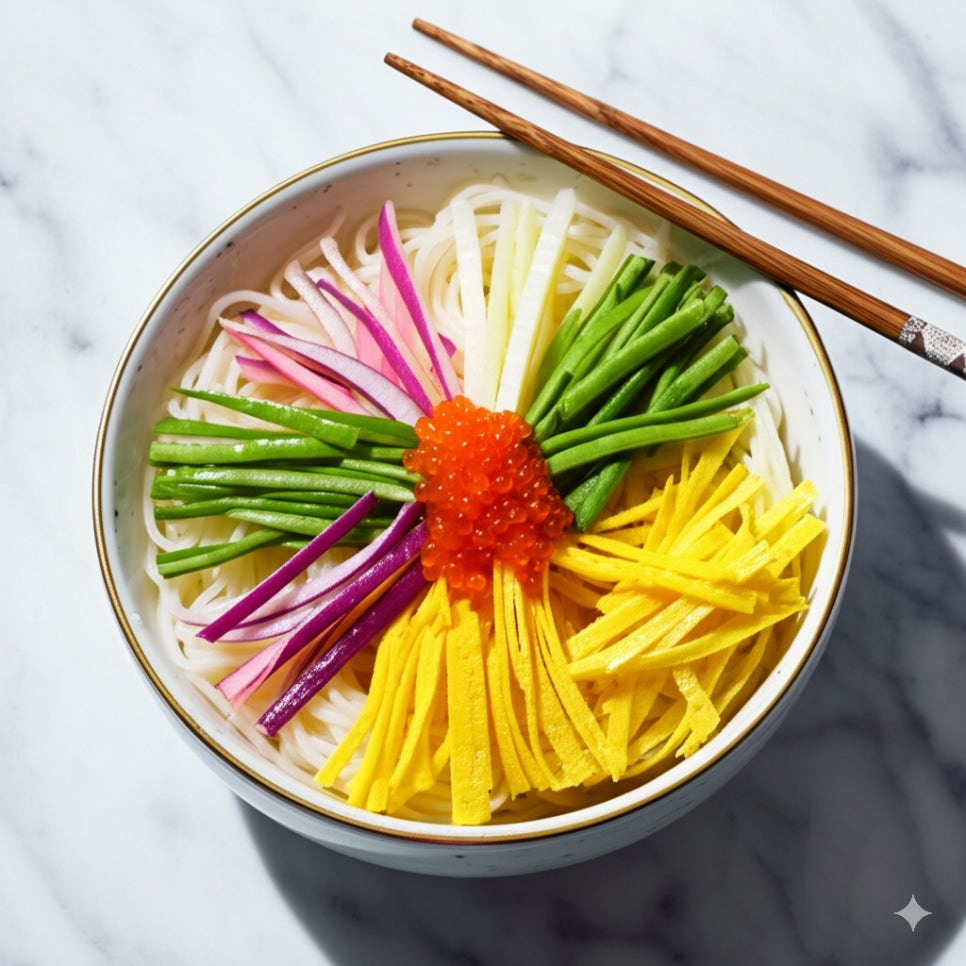 <이미지: 그릇에 소면을 담고 육수를 부은 후 고명을 올리는 모습>