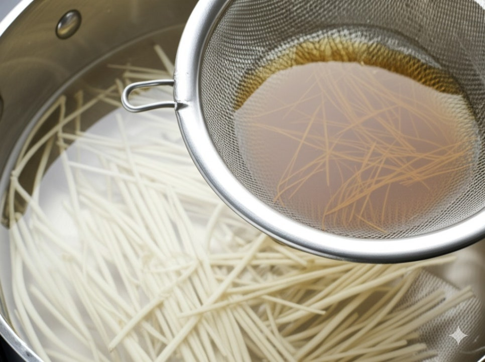 <이미지: 끓는 물에 소면을 삶고 찬물에 헹궈 물기를 빼는 모습>