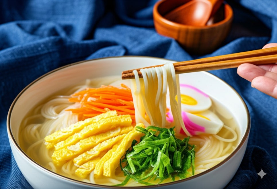 <이미지: 젓가락으로 잔치국수를 맛있게 먹는 모습 (따뜻한 김이 살짝 올라오고, 면발이 윤기 있게 보인다)>