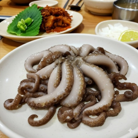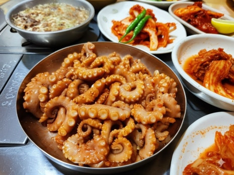 <이미지: 쫄깃하고 신선한 세발낙지 요리와 푸짐한 홍어삼합 한 상 차림>