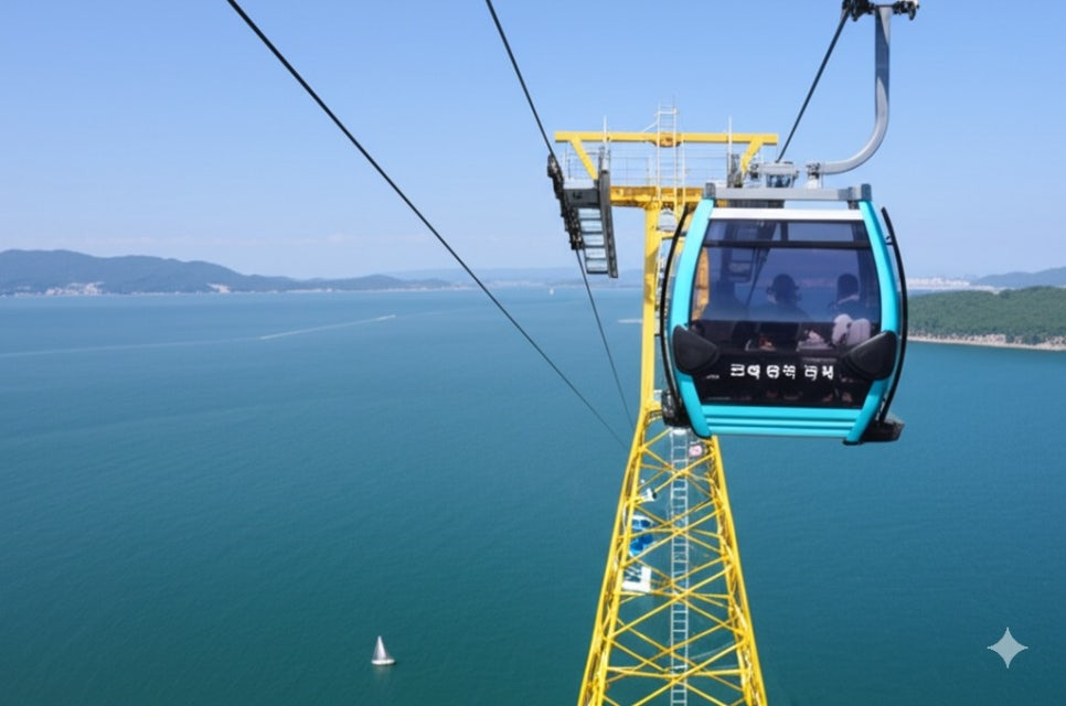 <이미지: 형형색색의 목포 해상 케이블카가 푸른 바다 위를 가로지르는 모습과 케이블카 안에서 바라본 다도해 풍경>