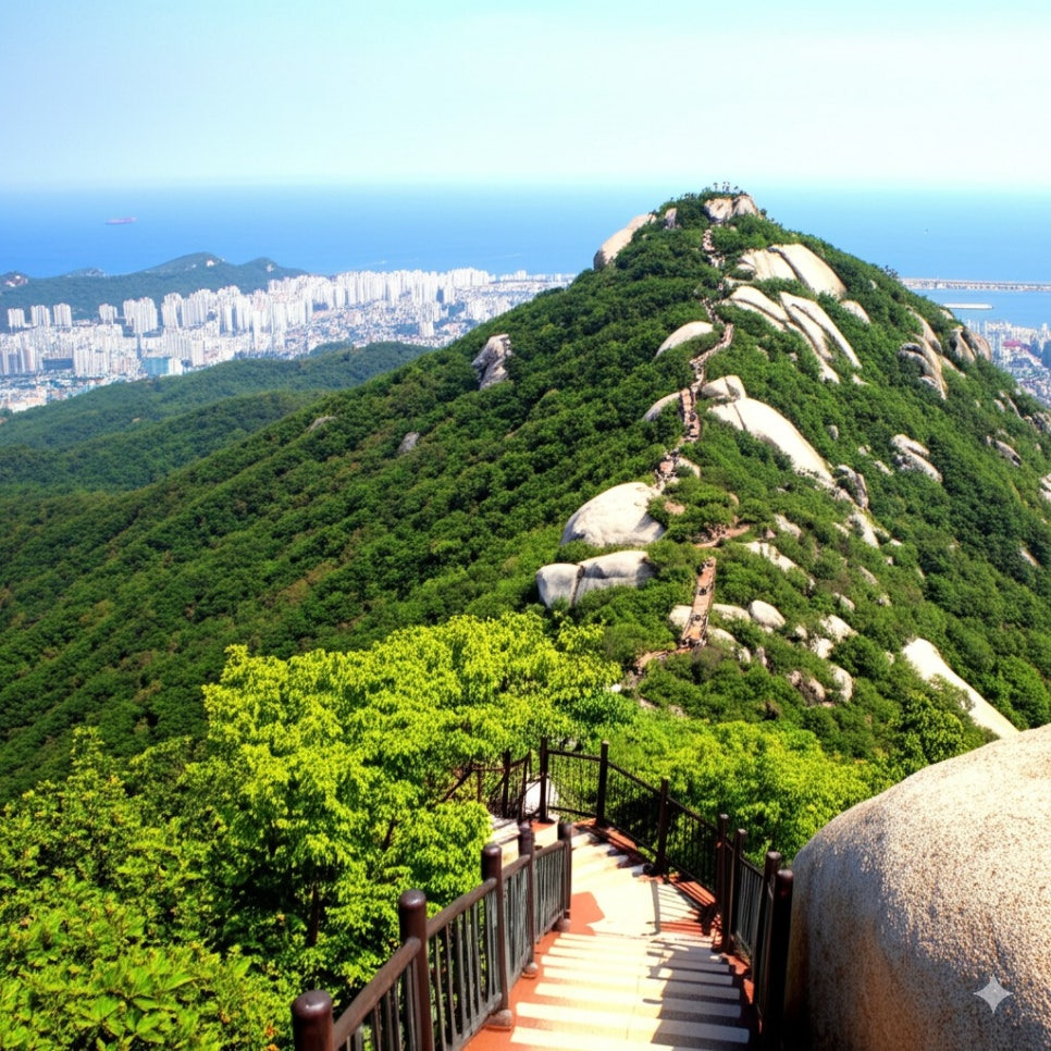 <이미지: 푸른 나무들과 기암괴석 사이로 난 유달산 등산로와 정상에서 내려다본 목포 시내 및 바다 풍경>