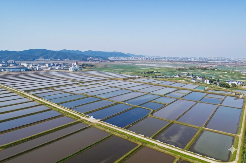 <이미지: 넓게 펼쳐진 압해도 염전 풍경과 김대중 대통령 생가의 모습>