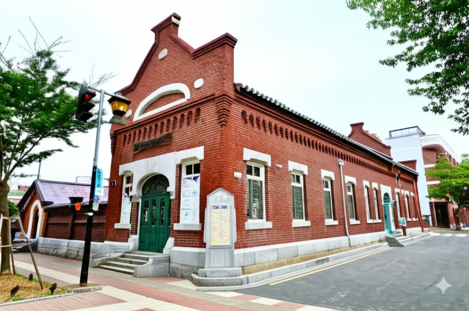 <이미지: 붉은 벽돌 건물의 목포 근대 역사관과 주변 거리를 거니는 사람들의 모습>