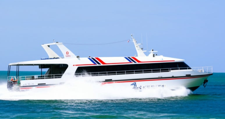 <이미지: 여수 여객선터미널에서 출항하는 쾌속선과 푸른 바다>