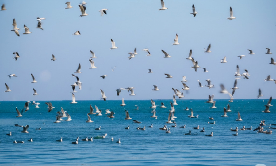 <이미지: 푸른 바다와 넓은 백사장을 배경으로 갈매기들이 날아다니는 평화로운 만리포 해수욕장의 풍경>