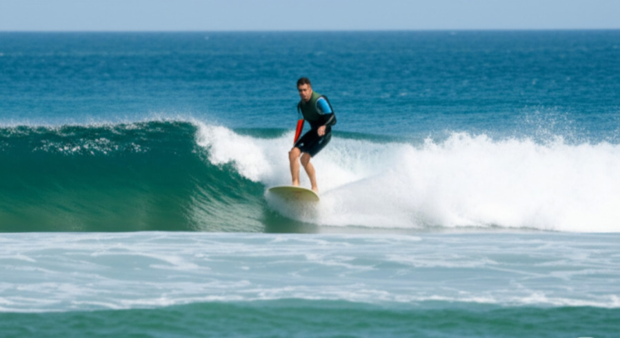 <이미지: 푸른 파도를 가르며 서핑을 즐기는 사람들의 역동적인 모습과 제트스키를 타고 질주하는 사람들의 신나는 모습>