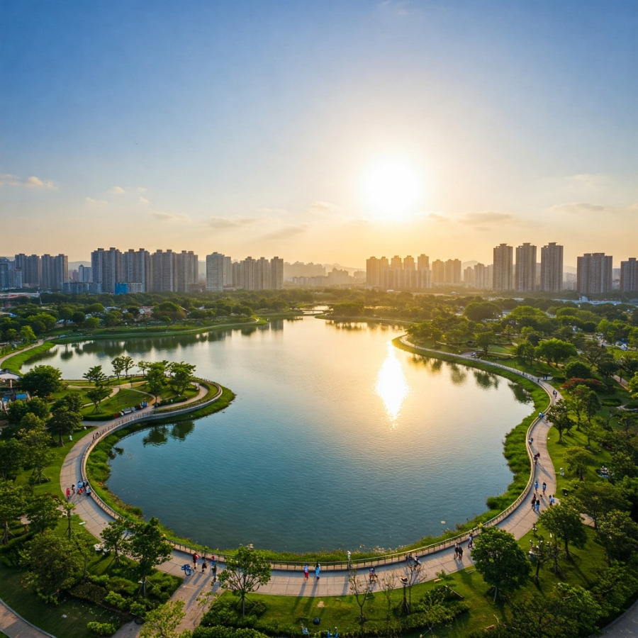 <이미지: 푸른 호수를 따라 조성된 동탄호수공원 산책로와 주변 빌딩 풍경>
