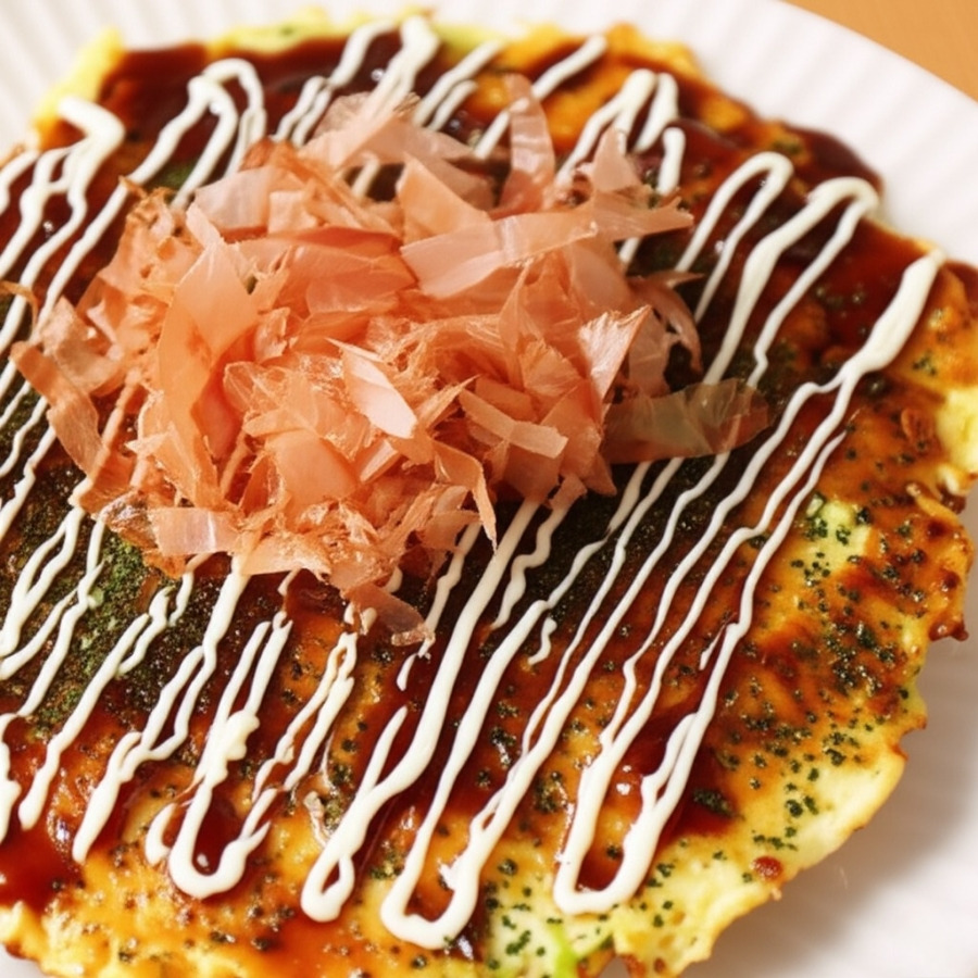 <이미지: 완성된 오코노미야끼에 가쓰오부시와 아오노리를 올리는 모습>