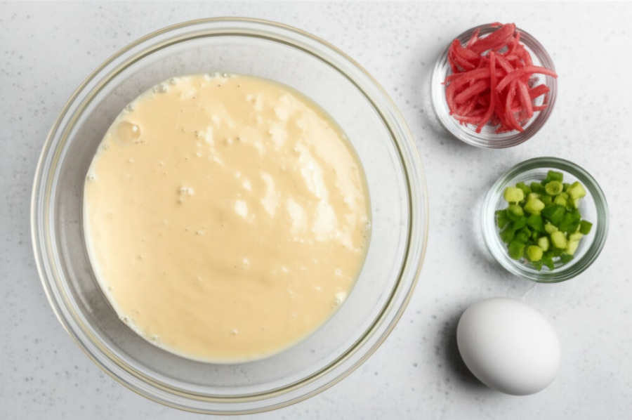 ④ ③의 채 썬 양배추와 대파, 텐카스, 생강 절임 등 선택 재료를 ②의 반죽에 넣고 주걱으로 가볍게 섞어줍니다. (너무 치대지 말고 재료들이 반죽에 코팅되는 느낌으로 섞어주세요.) 해산물을 넣는다면 이때 함께 넣어줍니다.