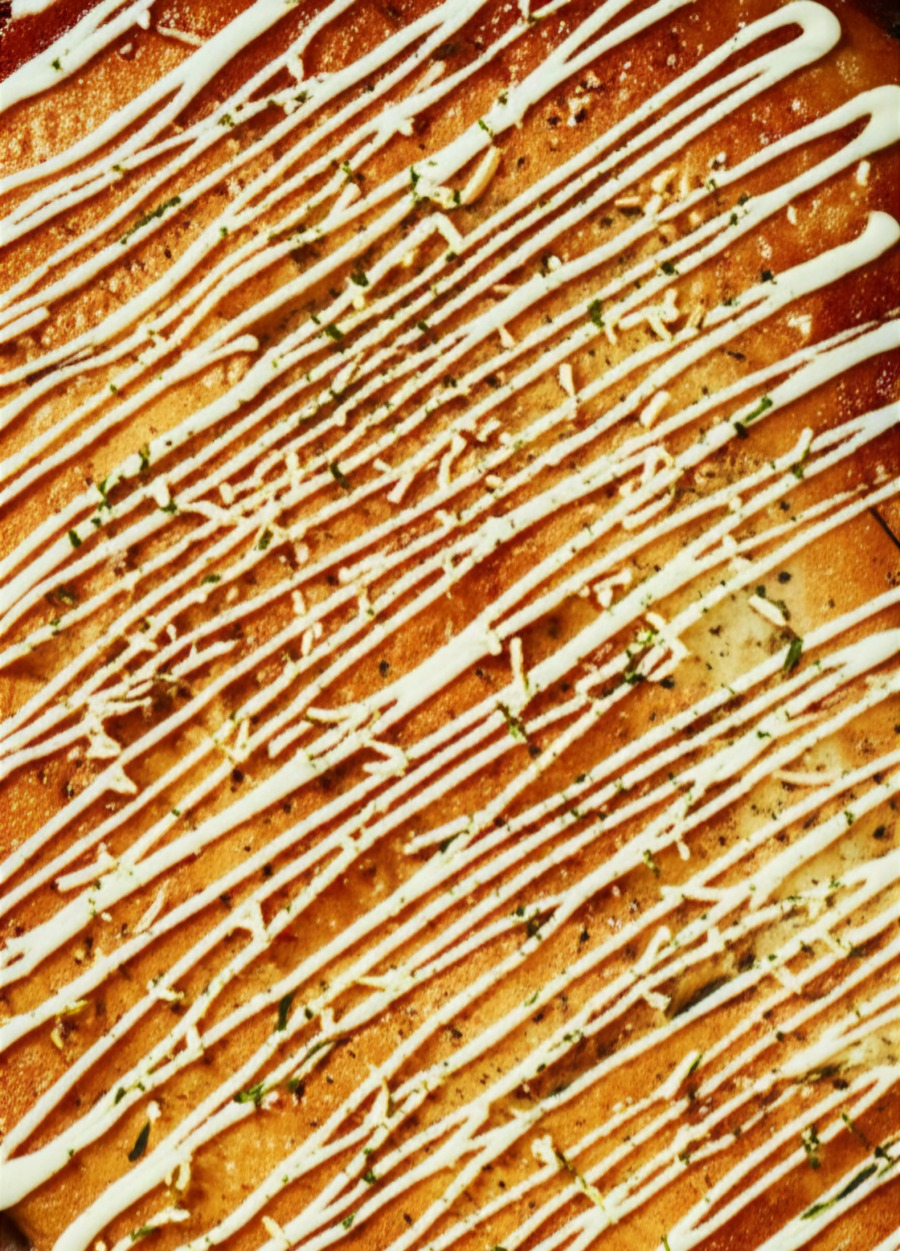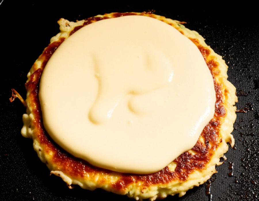 <오코노미야끼 위에 마요네즈를 뿌리는 모습>