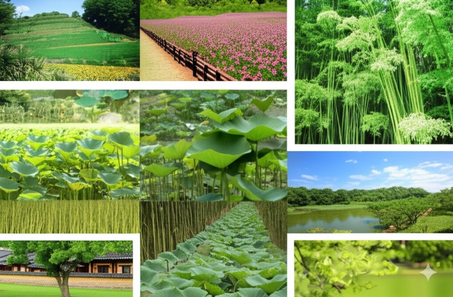 <이미지: 담양의 아름다운 자연 풍경을 담은 콜라주 (대나무 숲, 정원, 호수 등)>