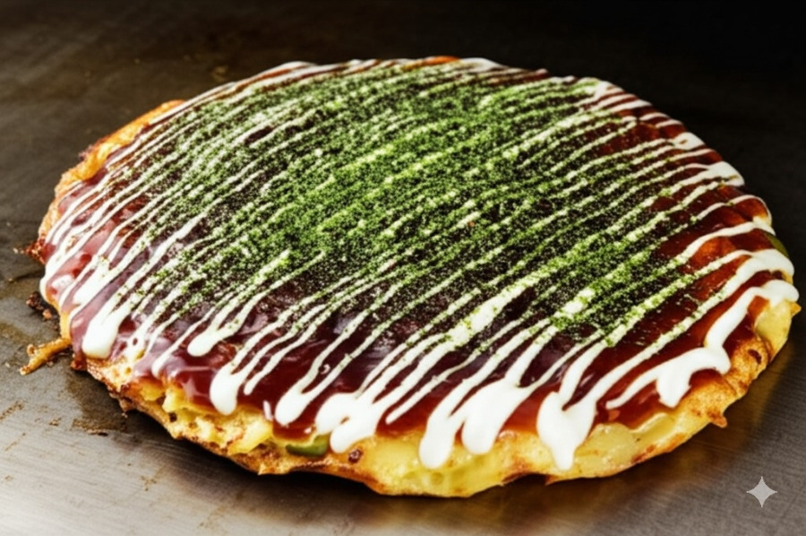 이미지: 완성된 오코노미야끼 위에 소스와 토핑을 뿌리는 모습