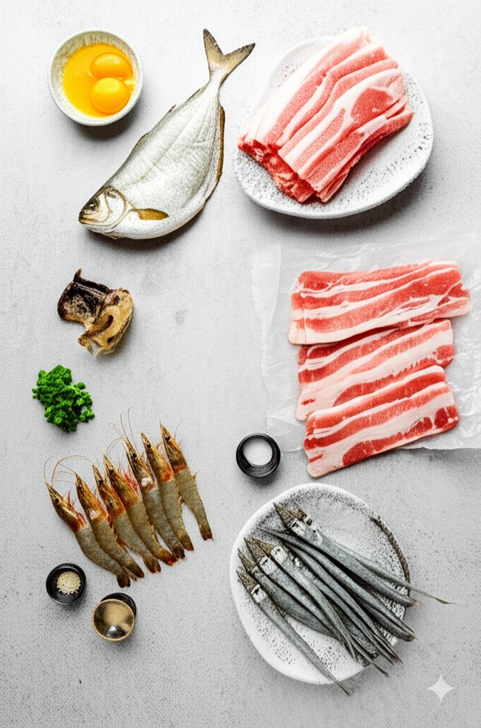 이미지: 다양한 속 재료 (돼지고기, 해산물, 김치 등) 들이 준비된 모습