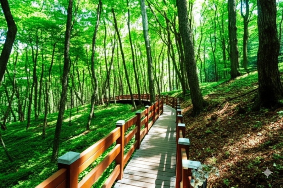<이미지: 햇살이 나뭇잎 사이로 부서지는 아름다운 횡성 자연휴양림 숲길 풍경. 걷기 편한 데크나 흙길이 보입니다.>