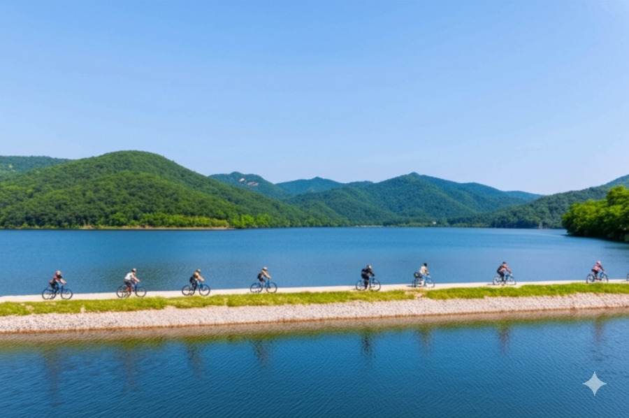 <이미지: 푸른 횡성호와 주변의 산들이 잔잔한 수면에 비치는 아름다운 풍경. 자전거를 타는 사람들의 모습이 작게 보입니다.>