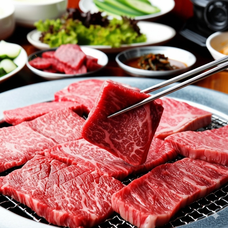 <이미지: 윤기가 자르르 흐르는 횡성 한우 숯불 구이와 맛깔스러운 밑반찬들이 차려진 풍성한 식탁>