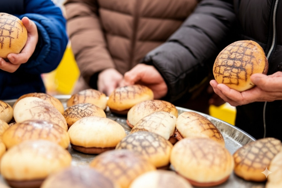 <이미지: 김이 모락모락 나는 다양한 종류의 안흥찐빵들이 쌓여있는 모습. 찐빵을 맛있게 먹는 사람들의 표정이 밝습니다.>