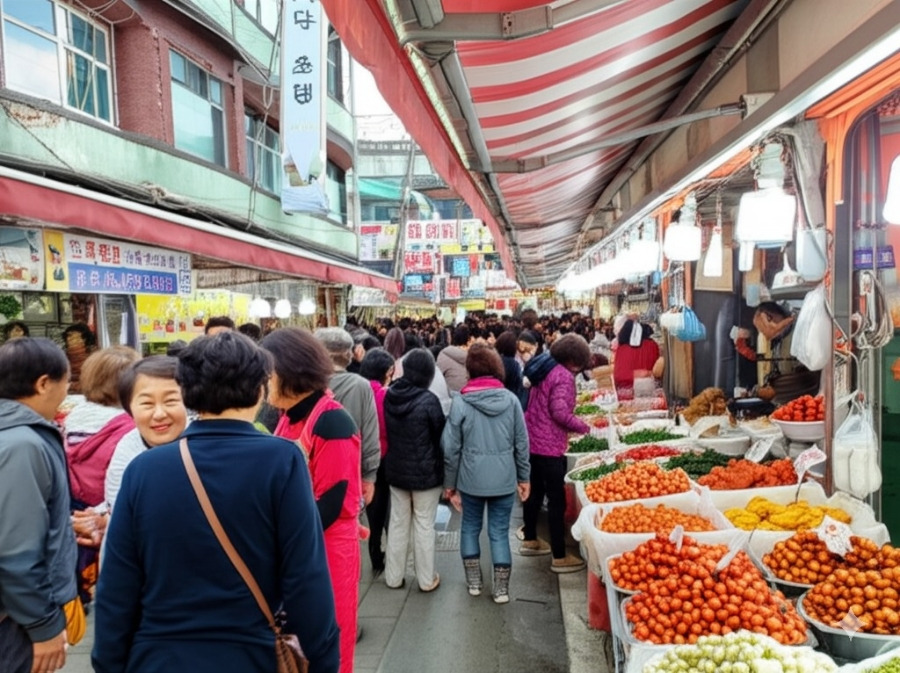 <이미지: 활기 넘치는 횡성 전통시장의 모습. 다양한 농산물, 특산품, 먹거리 등을 판매하는 상인들과 구경하는 사람들로 가득합니다.>