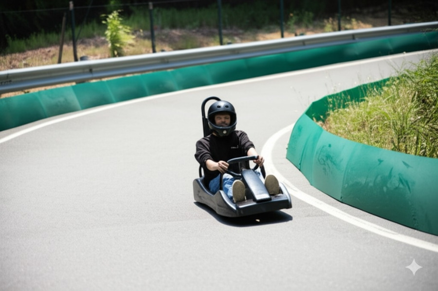 <이미지: 헬멧을 쓰고 루지를 신나게 타고 내려오는 사람들의 모습. 주변의 푸른 자연이 배경으로 펼쳐집니다.>