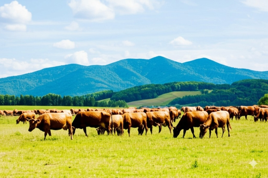 <이미지: 푸른 하늘 아래 펼쳐진 넓은 들판과 한가롭게 풀을 뜯는 소들의 모습. 멀리 보이는 산 능선이 평화로운 분위기를 더합니다.>
