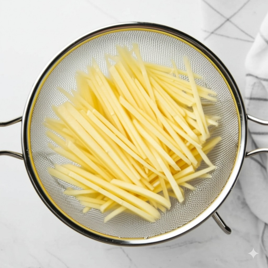 전분기를 뺀 감자는 체에 밭쳐 물기를 완전히 제거합니다.