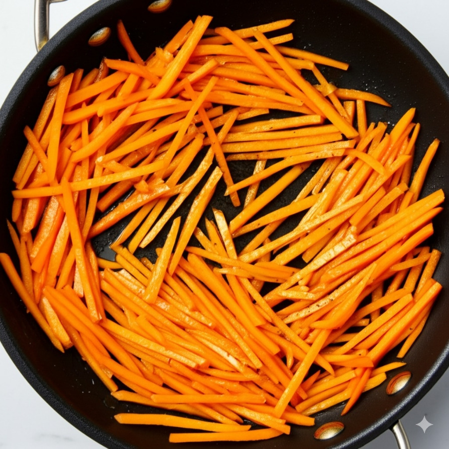 감자가 어느 정도 익으면 채 썬 양파와 당근을 넣고 함께 볶아줍니다.