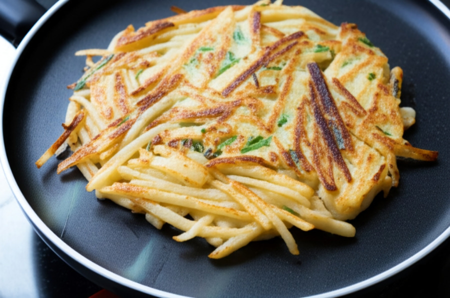 <이미지: 완성된 감자전을 접시에 담는 모습>