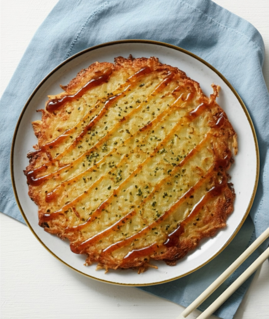 <이미지: 노릇하게 잘 부쳐져 접시에 담긴 감자전. 가장자리는 바삭해 보이고 속은 쫀득해 보이는 질감. 간장 소스 종지가 옆에 함께 놓여있는 모습.>