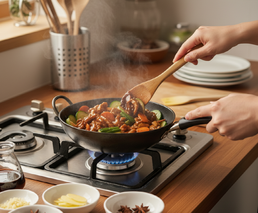 - 합치기: 덜어뒀던 볶은 돼지고기를 소스 팬에 다시 넣고, 센 불에서 소스가 고기에 고루 묻도록 빠르게 볶아냅니다. 이 과정은 1분 이내로 짧게 마무리하여 고기의 육즙이 빠지지 않도록 합니다.