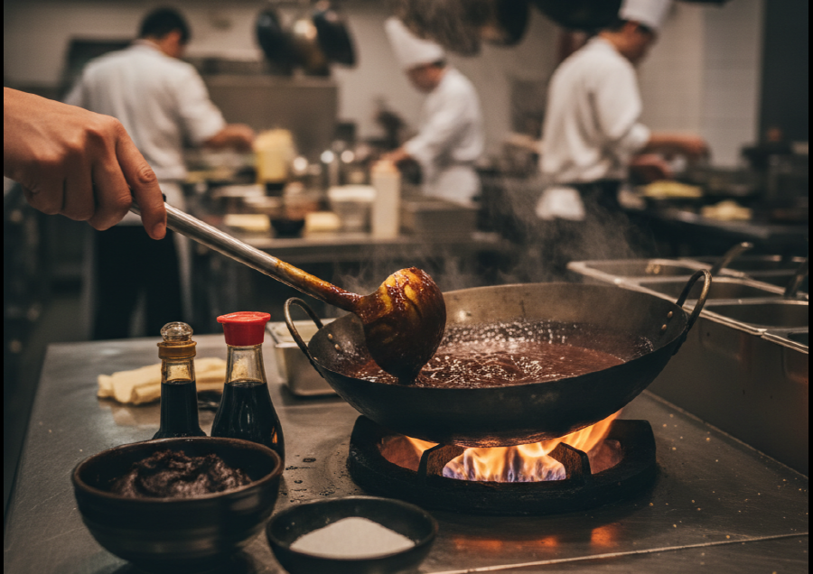 - 합치기: 덜어뒀던 볶은 돼지고기를 소스 팬에 다시 넣고, 센 불에서 소스가 고기에 고루 묻도록 빠르게 볶아냅니다. 이 과정은 1분 이내로 짧게 마무리하여 고기의 육즙이 빠지지 않도록 합니다.