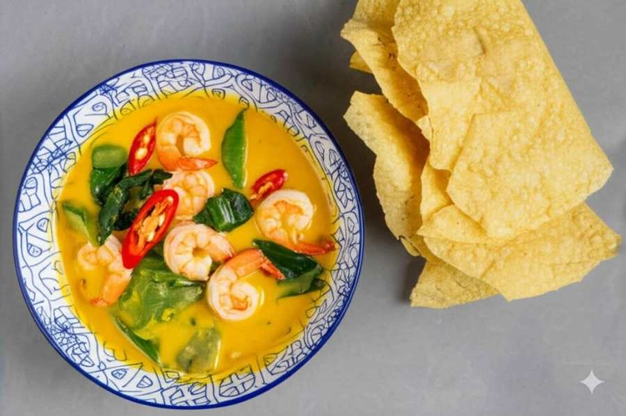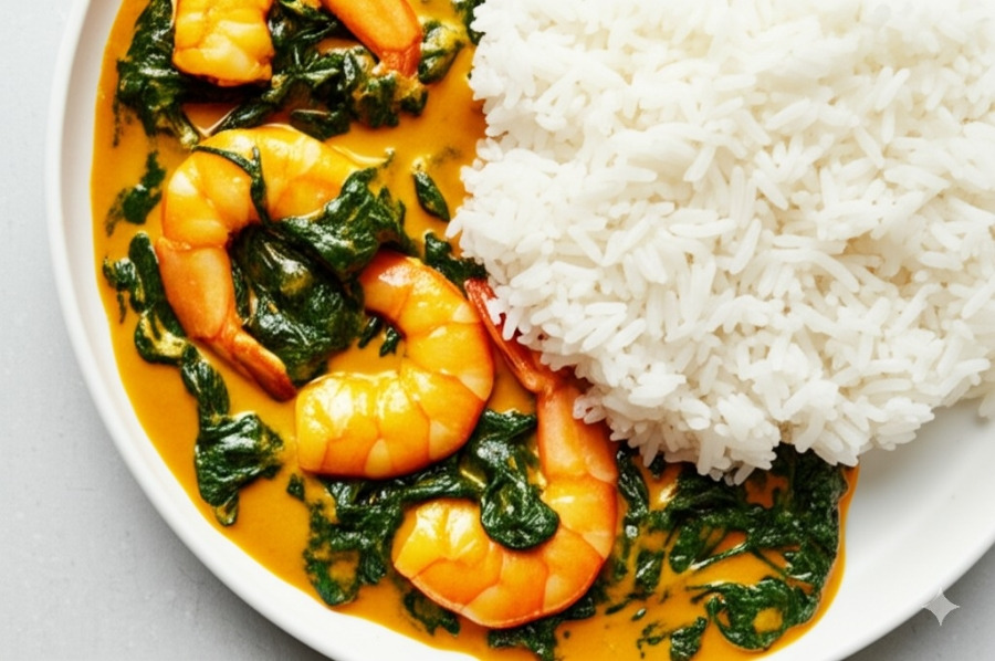 완성된 풋팟퐁커리를 접시에 담아 따뜻한 밥과 함께 즐기세요!