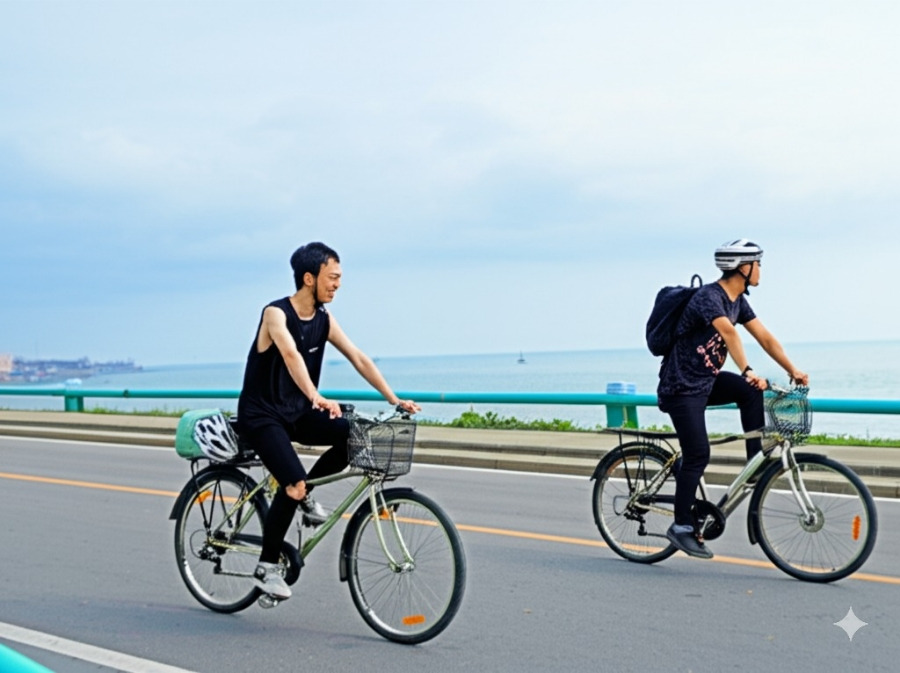 **<이미지: 자전거를 타고 제부도 해안가를 달리는 사람들의 모습>**