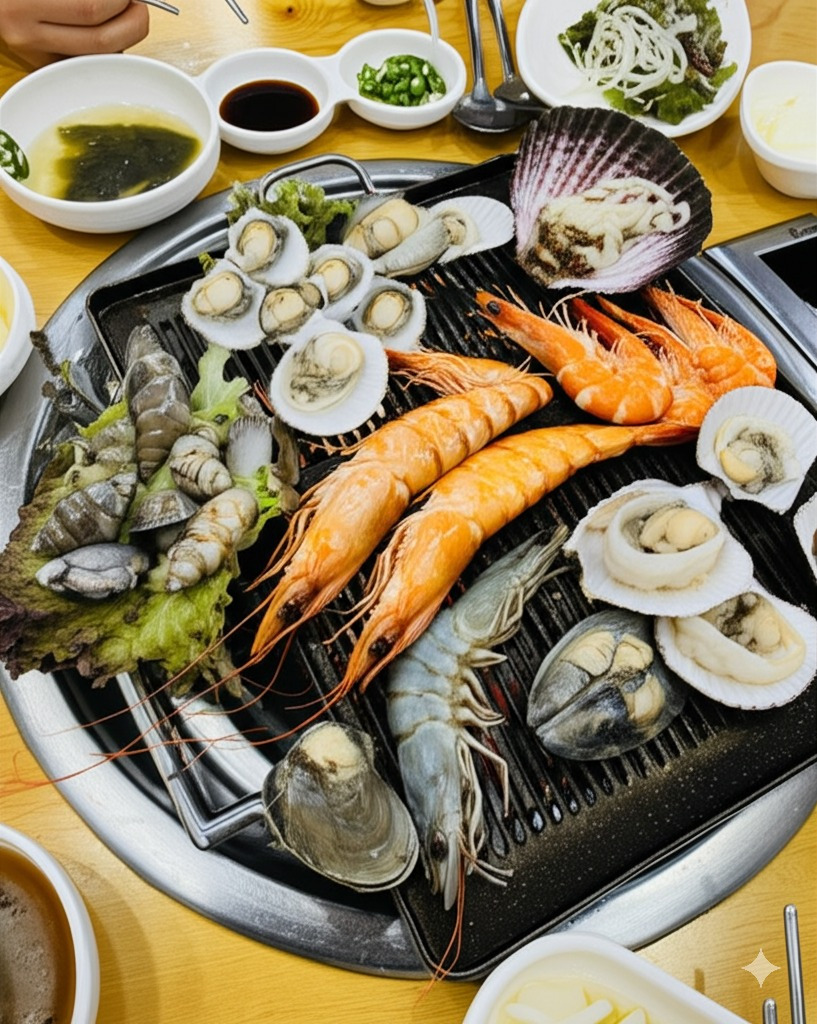 **<이미지: 푸짐한 조개구이 한 상 차림 (조개, 새우 등)>**