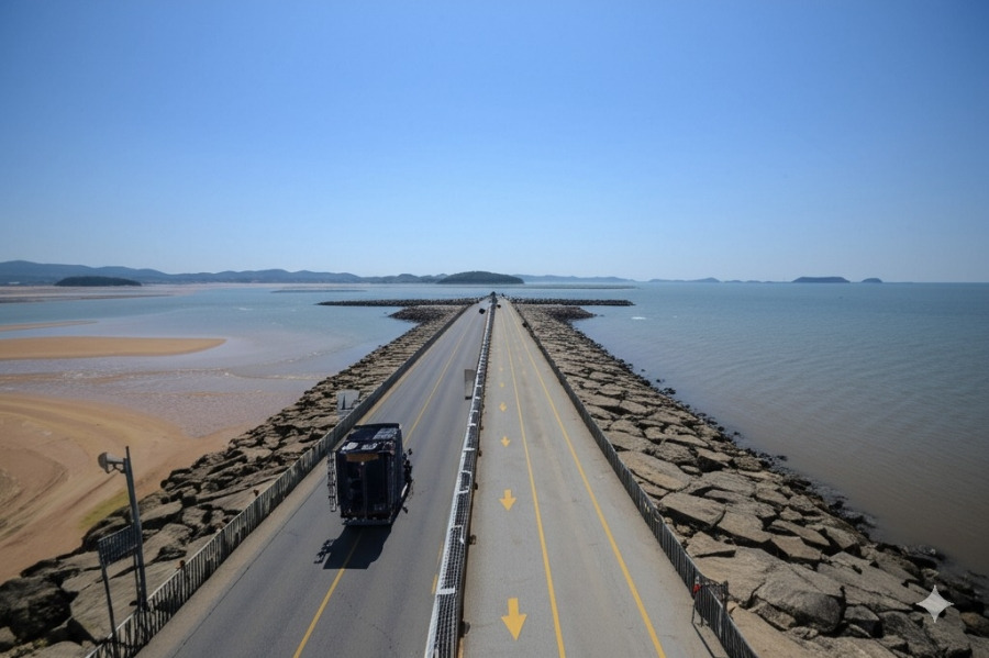 **<이미지: 썰물 때 드러난 제부도 바닷길과 그 위를 달리는 차량들, 멀리 바다가 보이는 풍경>**