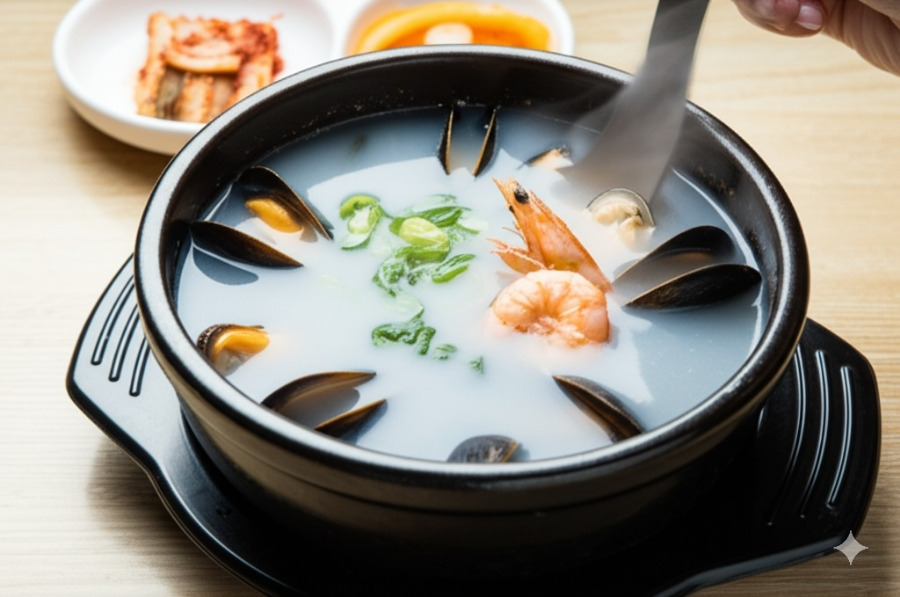 **<이미지: 푸짐한 해물 칼국수 한 그릇 (새우, 조개 등 해산물 가득)>**