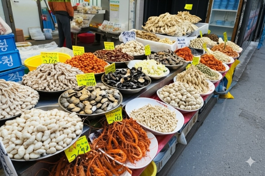 **<이미지: 제부도 특산물 판매점 풍경 (해산물 건어물 등)>**