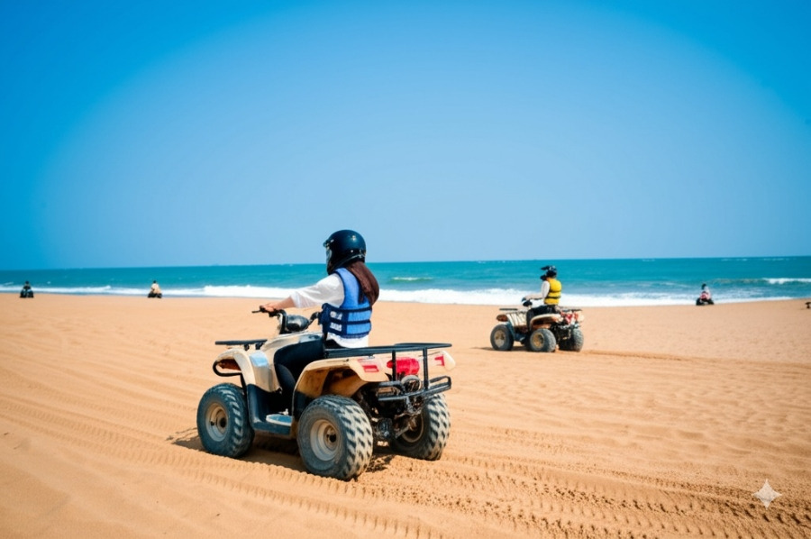 **<이미지: 해변에서 ATV를 타는 사람들의 모습>**