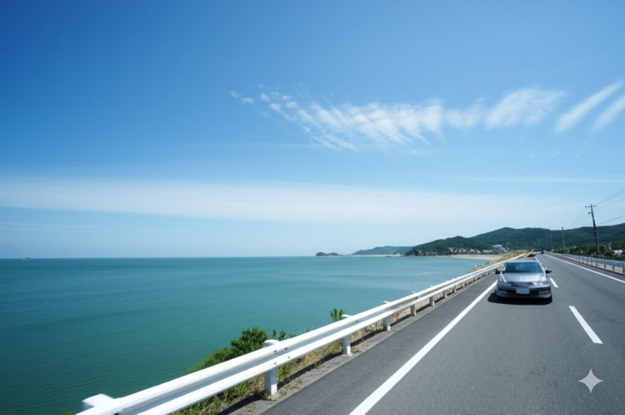**<이미지: 제부도 해안 도로를 따라 드라이브하는 차량과 푸른 바다 풍경>**