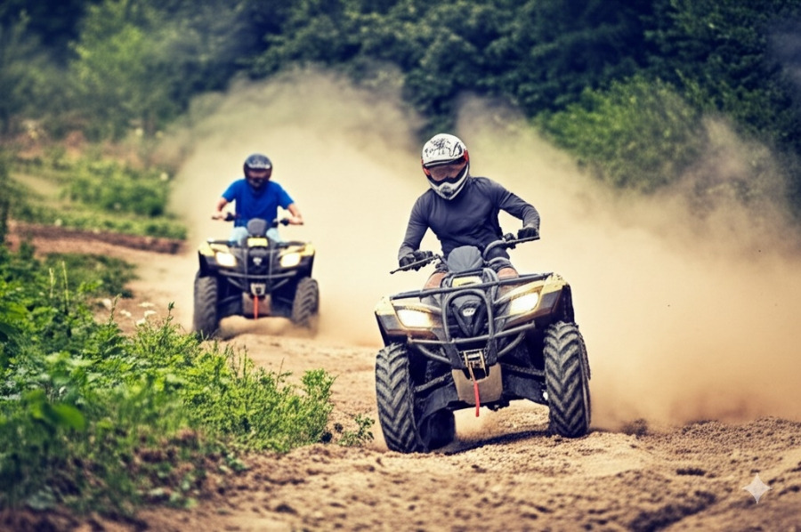 <이미지: 흙먼지를 일으키며 산길을 달리는 ATV의 모습>